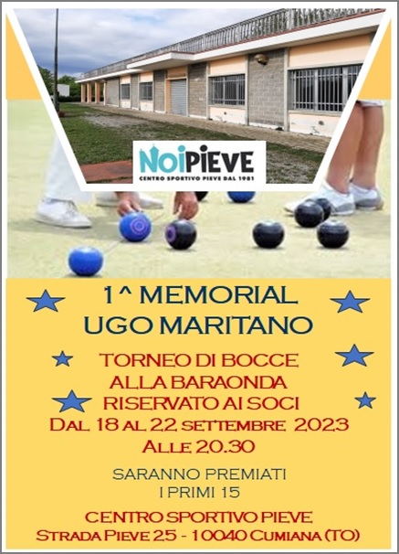 siamo lieti di annunciare l'atteso torneo di bocce alla baraonda riservato ai soci in memoria di Ugo Maritano. Un evento speciale per onorare la memoria del nostro caro amico e membro del nostro centro sportivo. Sarà un'occasione per riunirci, divertirci e ricordare insieme i momenti felici trascorsi con Ugo.