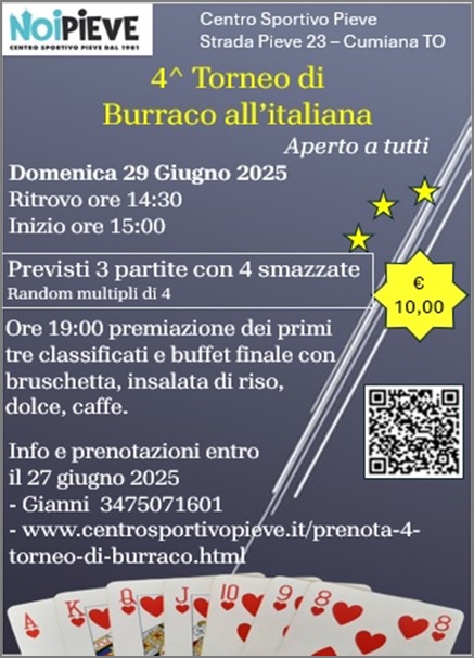 Siamo felici di annunciare che domenica 29 giugno presso il Centro Sportivo Pieve si terrà un torneo di Burraco!