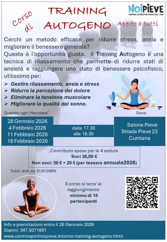 Sei pronto a scoprire il potere del relax? Al nostro "Corso di Training Autogeno" presso il Centro Sportivo Pieve, ti guideremo in un viaggio verso il benessere mentale e fisico. Il training autogeno è una tecnica di rilassamento che ti insegna a controllare la tua mente e il tuo corpo, aiutandoti a ridurre lo stress e migliorare la concentrazione. Durante il corso, apprenderai esercizi semplici e pratici che potrai facilmente integrare nella tua vita quotidiana. Che tu sia un principiante o abbia già esperienza, il nostro approccio è alla portata di tutti. In un ambiente accogliente e stimolante, condivideremo strumenti e strategie per affrontare le sfide quotidiane con maggiore serenità. Unisciti a noi e inizia a trasformare il tuo modo di vivere: il relax è a portata di mano! Non perdere l’occasione di prenderti cura di te stesso in modo semplice e naturale.