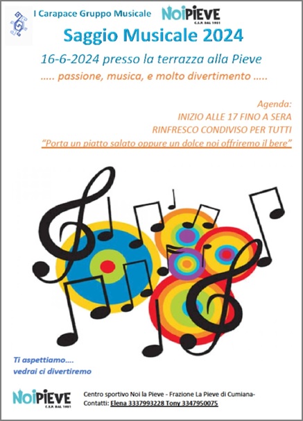 Grande iniziativa, domenica 16 giugno alle ore 17.00, con la rappresentazione di un fantastico saggio musicale del gruppo Carapace, carico di musica, passione e divertimento, qui presso il Centro Sportivo Pieve.