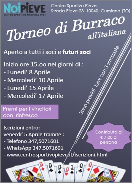 Cari amici del Centro Sportivo Pieve, siamo entusiasti di annunciare che lunedì 8 aprile si terrà il primo torneo di Burraco "Centro Sportivo Pieve" presso il nostro centro!