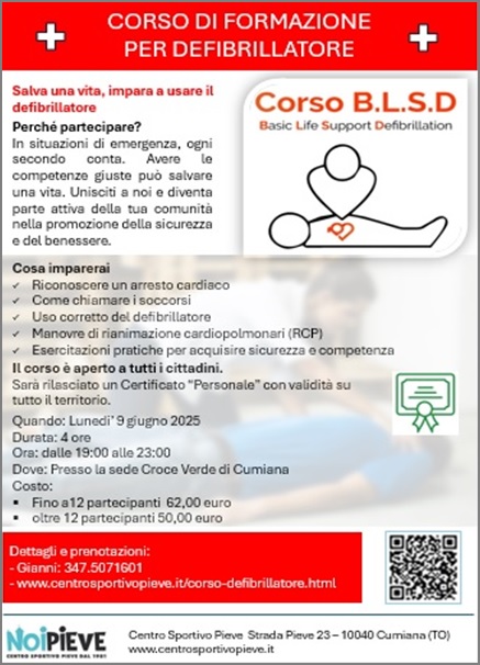 Siamo lieti di annunciare che il Centro Sportivo Pieve organizza un corso dedicato all'utilizzo del defibrillatore presso la Croce Verde di Cumiana.